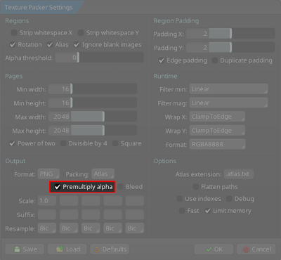 Texture Packer setting Premultiply alpha disabled, Bleed enabled.